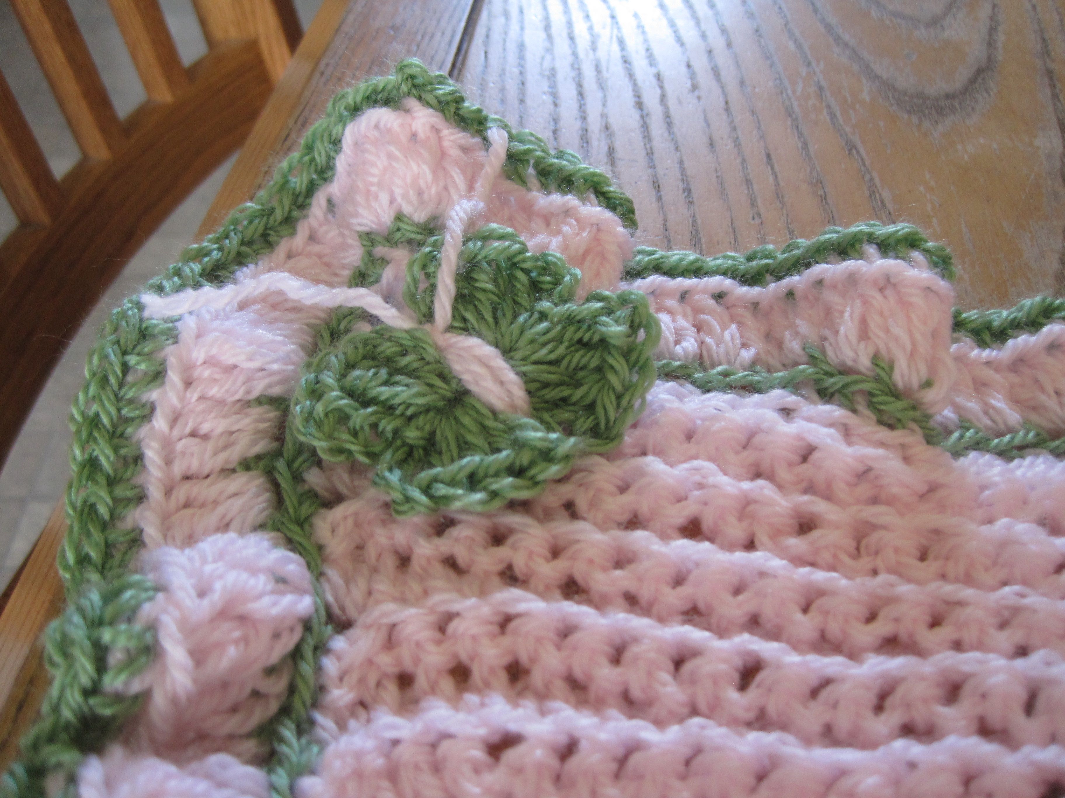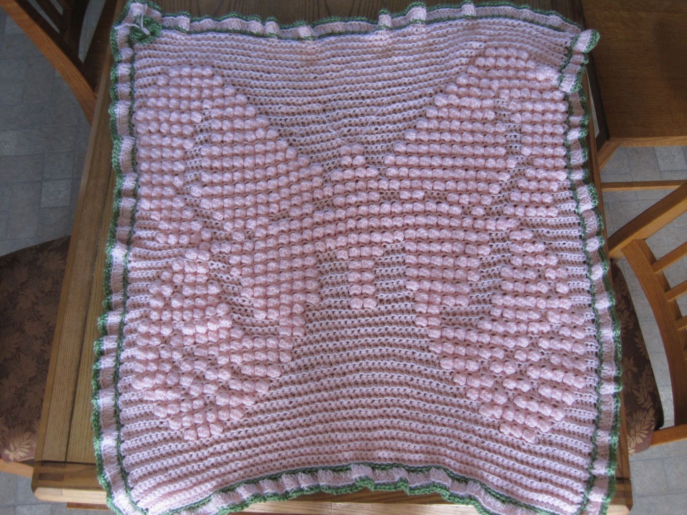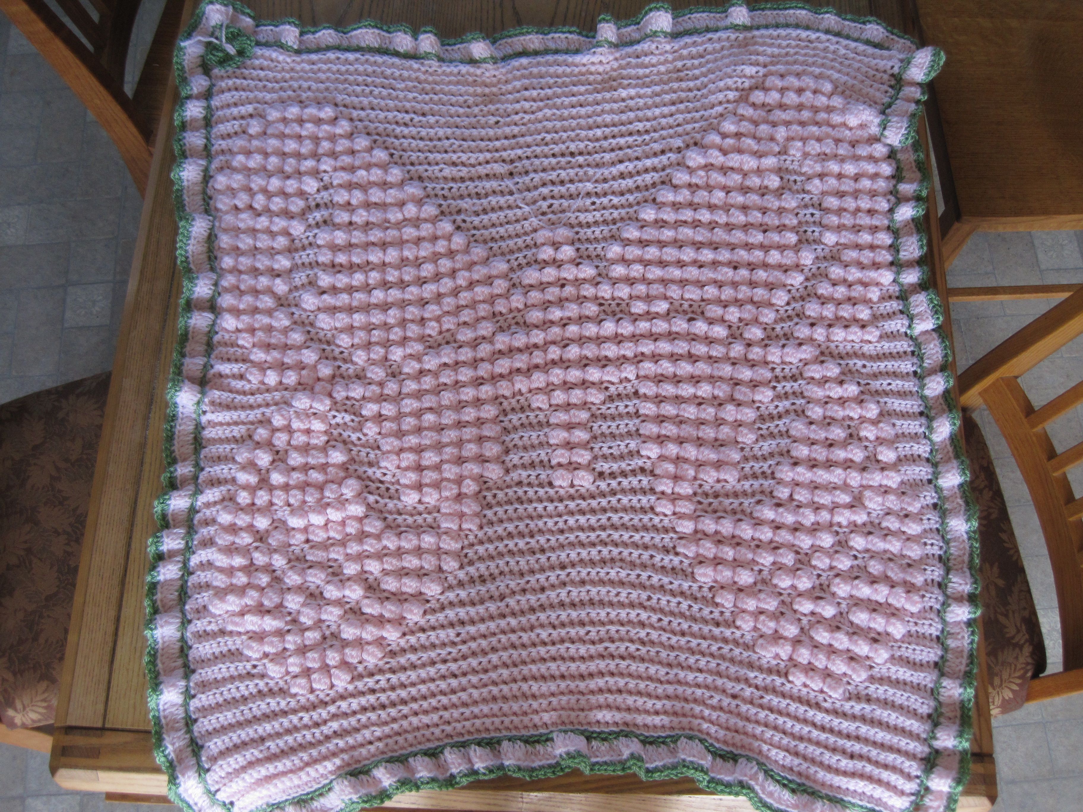 I made this afghan for the daughter of a close friend who loves butterflies. My go-to pattern for baby afghans has an angel design (see here). It is quite simple and easy to do. However, I wanted to try something new this time and so, rather than the angel, I designed my own butterfly pattern. The original pattern has the entire blanket in the same colour. I tend to like using a different colour in the edging.